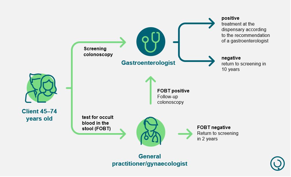 In case of a positive test result (FOBT+), screening colonoscopy is indicated.